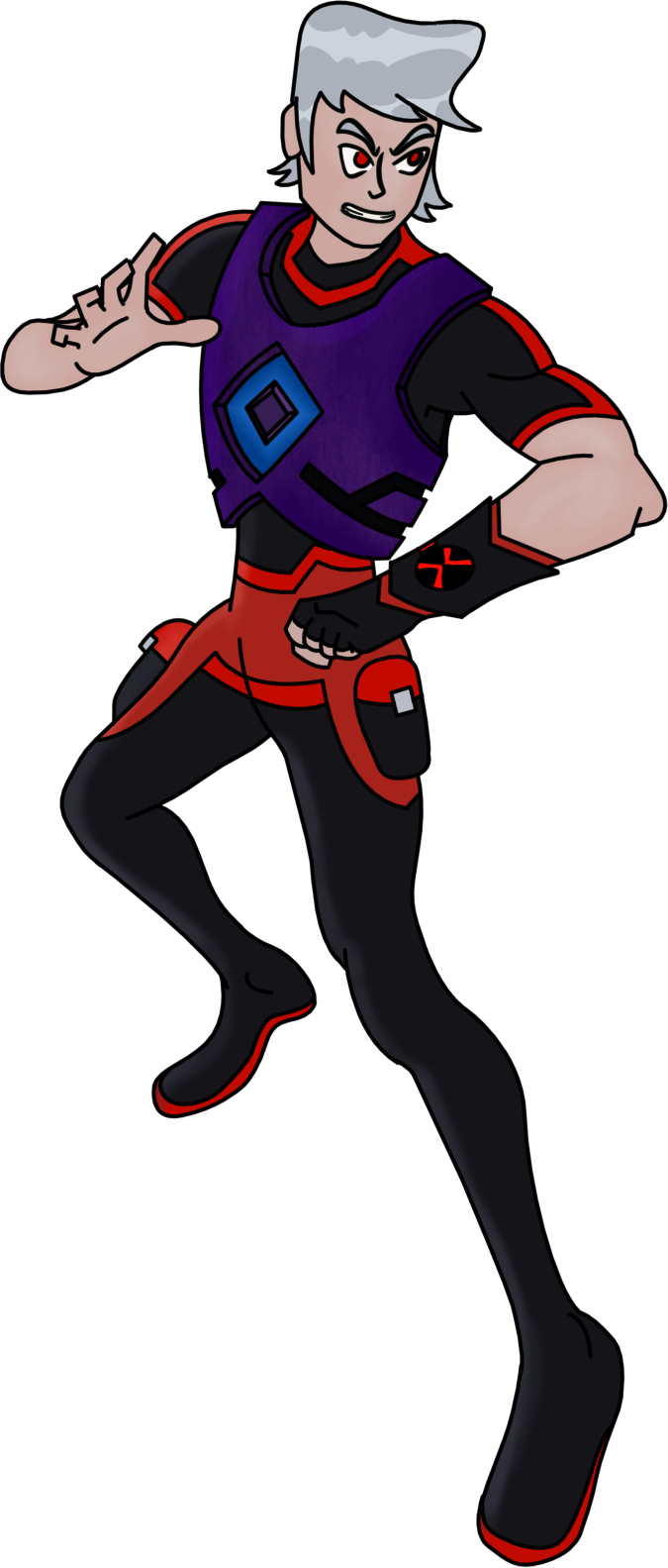 The Negativitrix is a sleek black and red gauntlet made of a soft bioplastic not totally unlike the T1 Prototype Omnitrix but generally softer. Attached to it is a black fingerless glove covering his left hand.