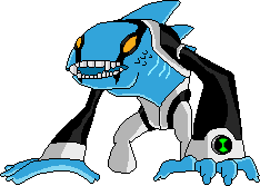 Ice cold fluid runs through Bryce's veins from the Omnitrix up through his arm and into his face and specifically his eyes which close briefly, then burst with orange light. His back arches forward, three shark-like fins sprout from his spine. Then, his right hand pulses as his skin is turned ice blue and small claws grow from the tips of his fingers. He spins once, then slams his front left leg down, the Omnitrix badge glowing brilliantly as he releases cold air from his mouth.