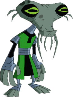 Azmuth is a tiny grey alien only 4 inches tall. he wears green and black robes robes with metal braces. he has green eyes.