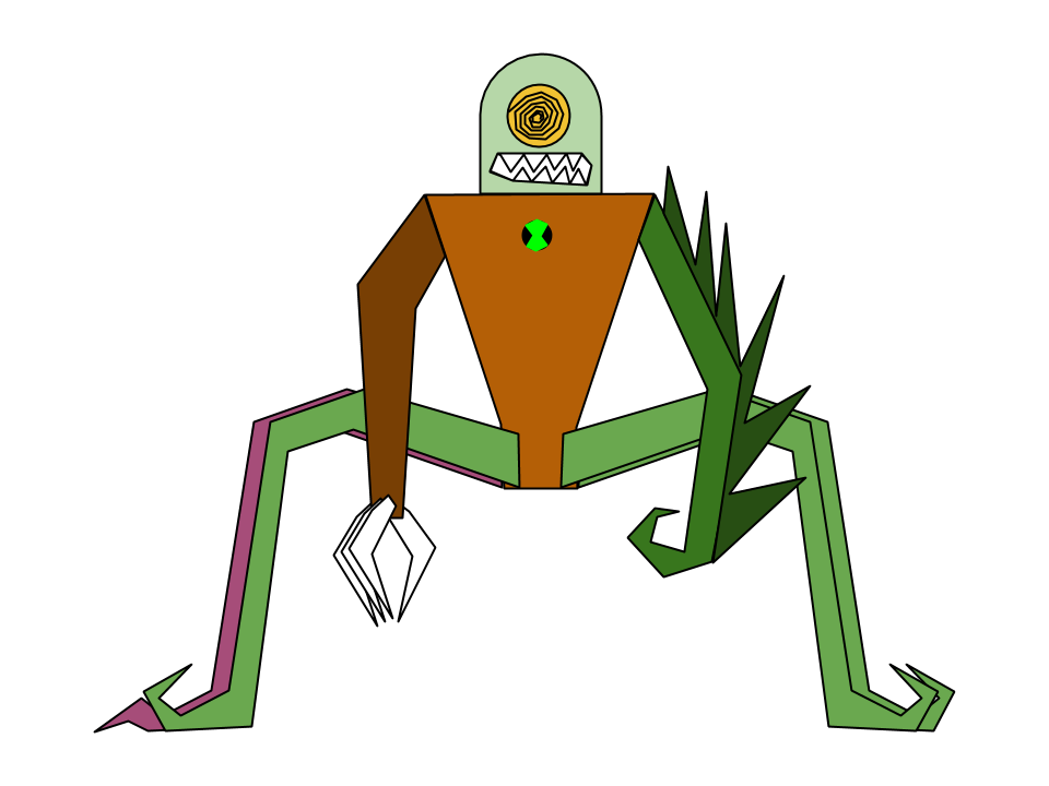 Biohazard has four legs, three of which are green and vine like while one is a purple tentacle. Biohazard's right hand is furry and bear-like with a large claw as a hand, while his left is a spiky vine.