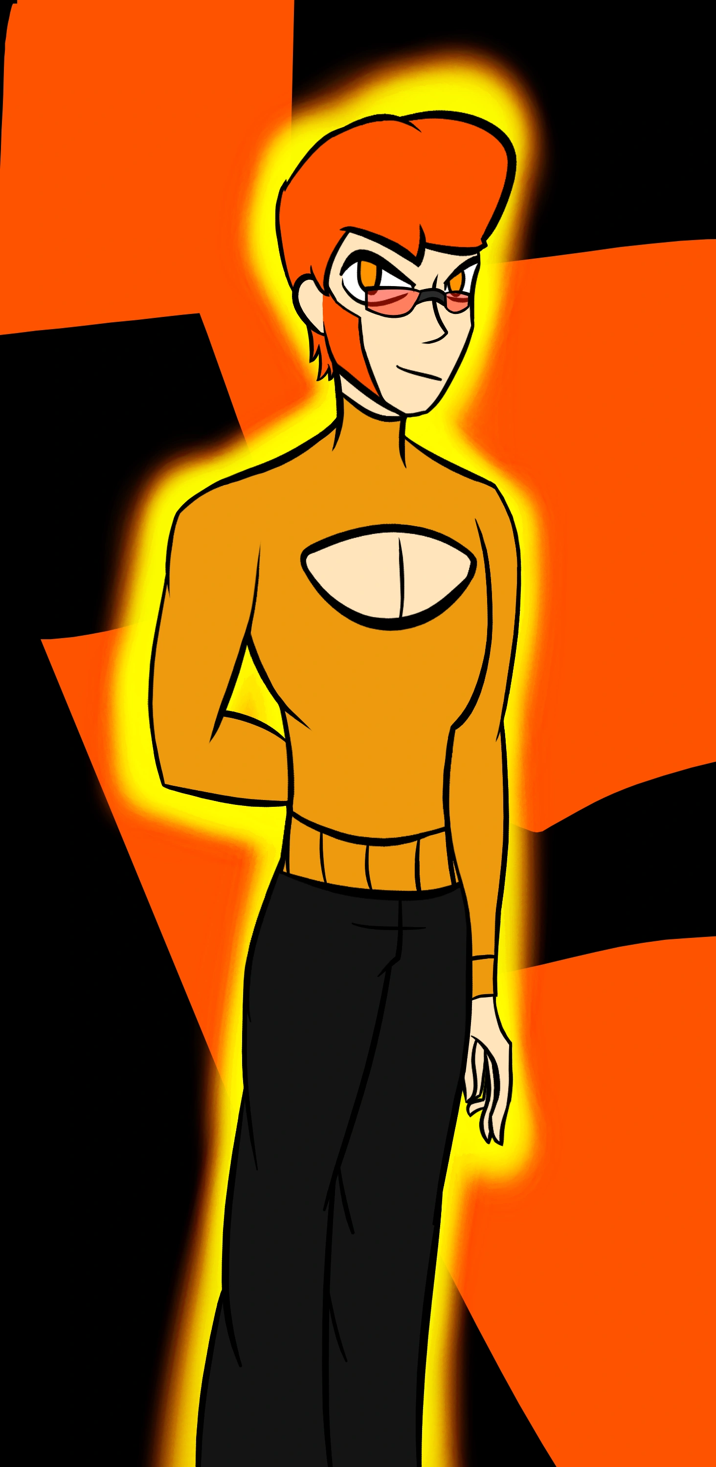 Cancer is a white-skinned male with orange hair, orange eyes, and a lean build. He has some sort of facial markings on his cheeks that match his hair color, and he wears a pair of small glasses with orange lenses. His outfit consists of an orange turtleneck sweater with a hole over the chest, a pair of black jeans, and rather expensive black shoes.