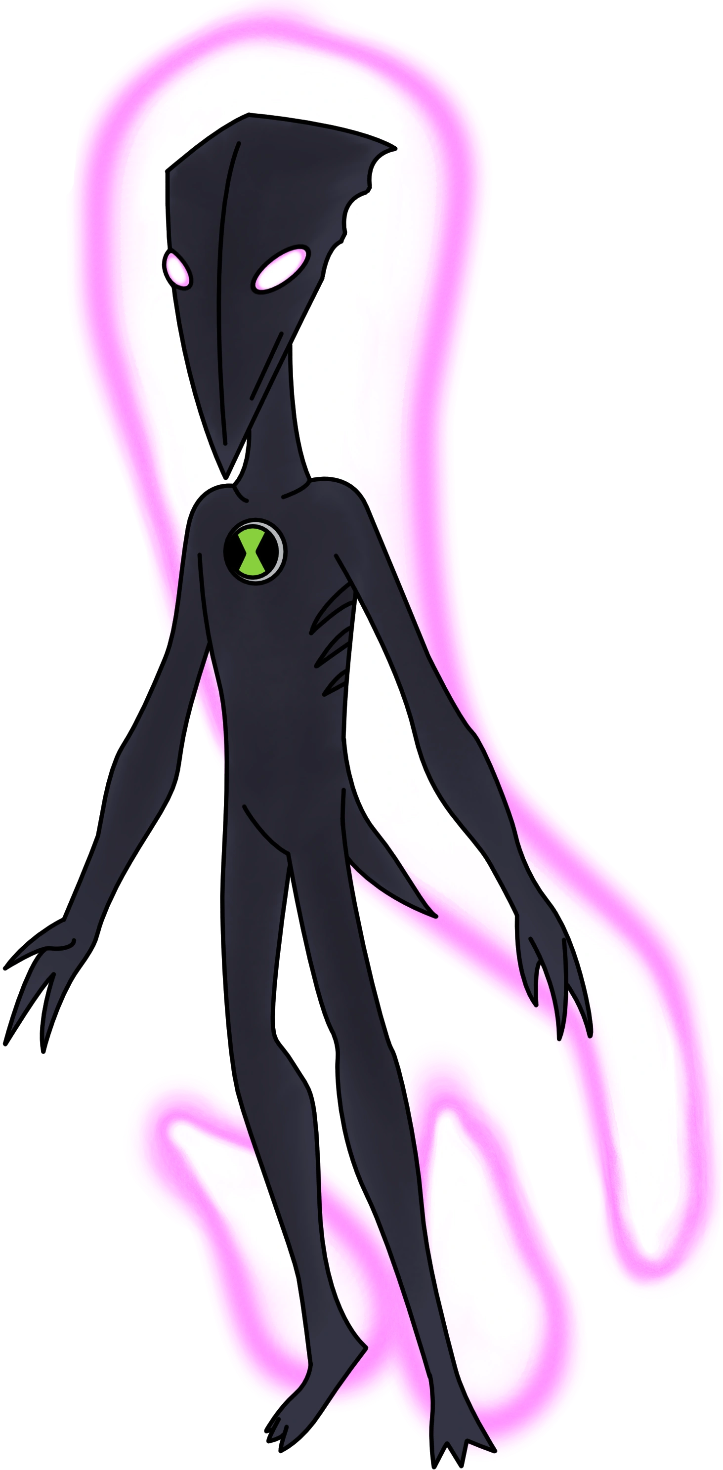 He is a thin humanoid figure with ash black skin. His head is sharp and triangular, with deep grooves in his chest. Flowing energy pours out of the back of his head and ankles, and his eyes are bright green. The Biomnitrix symbol is on his chest.