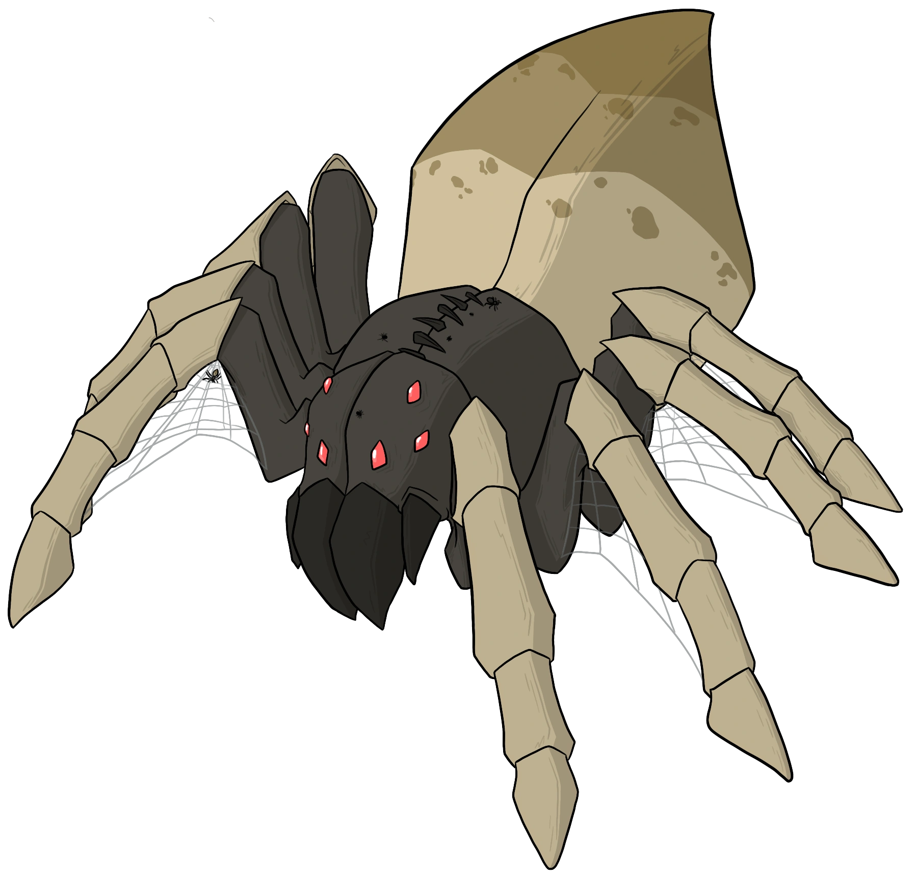 Horde Weavers are large arachnids, that average around 10 feet (3 meters) in length as adults. Their bodies are a very dark brown-ish black, with lighter brown armoured plating covering most of their legs, as well as the abdomen. They have six red eyes, and four large fangs. Along their head, mid-section and most of the abdomen is a seam, which opens up to reveal their internal cavern, which houses their 'horde'. They often have several members of their horde roaming across their body, cleaning them.