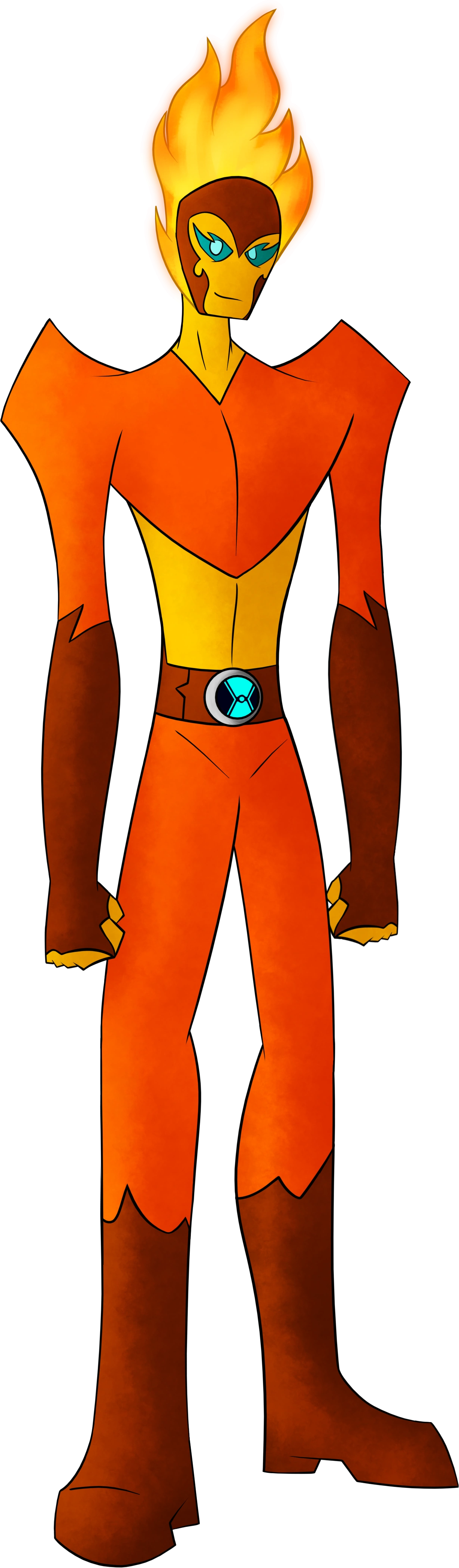 Kugelblitz is a tall, humanoid alien with a yellow color scheme and an orange uniform. His head is constantly spewing flames, and the Omnitrix symbol is on his belt. In his Fired Up form, his color scheme switches to a range of blues.