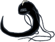 Last Shadow has inky black skin with a long snaking body. Four tendrils protrude from the back of his jaw bone, two on each side, and he has an exposed spine running down his back. He has sharp teeth.