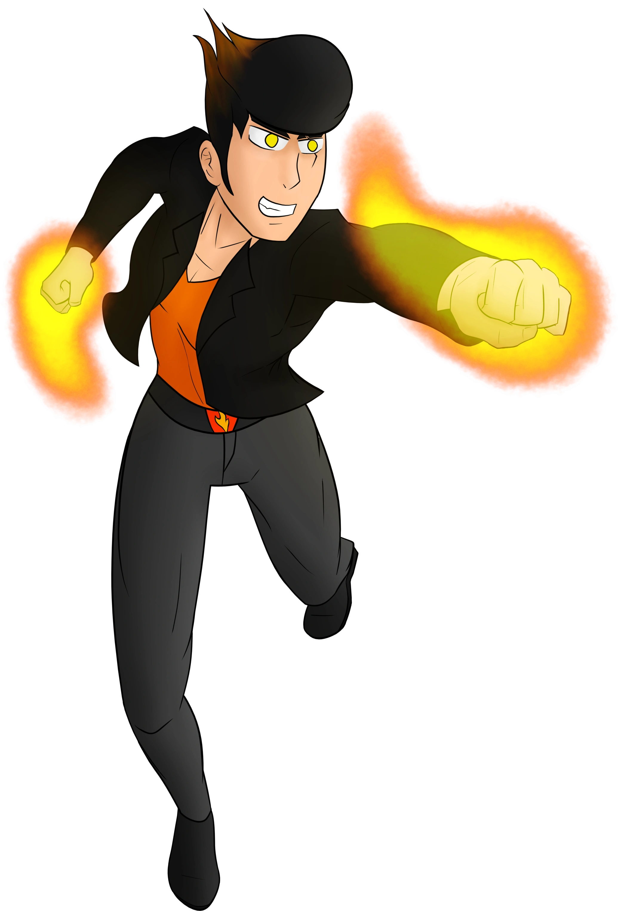 Pyros is a tall, Caucasian human with a stereotypical greaser appearance and a fire-based color scheme. He wears a belt buckle shaped like a flame, and has a large black pompadour that sweeps black into fire-like orange-yellow hair. His hard lifestyle has given him the appearance of being somewhere in his twenties despite only being 19.