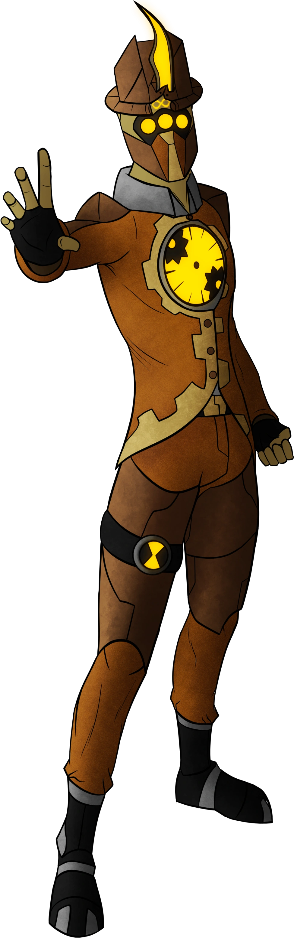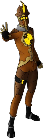 Stopwatch is a humanoid alien, with most of his design being steampunk inspired. He wears a vest with a gear pattern. His shirt underneath the vest has a collar which is positioned upwards around his neck. He has black boots on, bronze armor around his body with steampunk-like attributes (specifically his shoulders and thighs), and sports finger-less gloves. He wears a helmet with a large horn protruding from the very top of it. He has a glowing infinity symbol on his forehead and three eyes side by side. He has a clock-like piece with gears circling around it on his chest, which is black and orange, and no particular time is set on it.