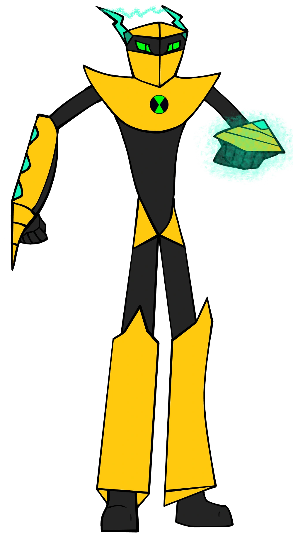 The nanobots making up Terminano converge into a very basic humanoid shape, with ports on his arms and horns showing the Eletatis Charge. The nanobots are gold and black in color.