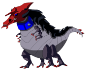 She has a segmented purple and gray body and a red head resembling that of a carnotaurus or a tyrannosaurus with a horn on her forehead.