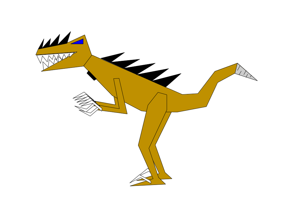 Velocityraptor looks like a light-brown velociraptor. He has black spikes on his back, and on his nose. He has big white claws and a drill at the end of his tail.